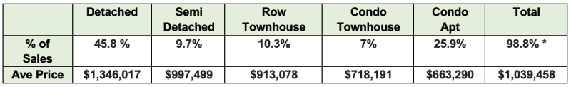 The missing 1.2% is made of 4 other categories, Link homes, Co-Op apartments, Detached Condos and Co- Ownership apts. They represent such a small % of the sales with negligible impact on the average price so I have not included them, to make the chart easier to read.